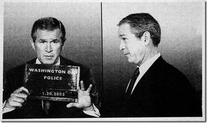 Pictures of US President George W. Bush clutching a clapboard with a date of his "arrest" - a day (1/28/2003) when he made "incriminating" statements regarding the Iraq war - were displayed on the New York Public Library's exhibit named "Line Up". The political satire art exhibit is a creation of artists Nora Ligorano and Marshall Reese. Source: NYDaily Tags: